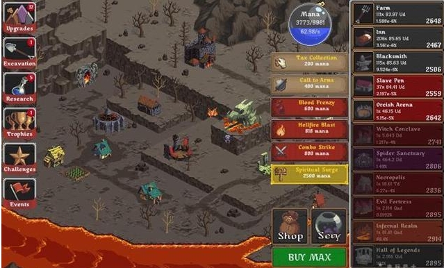 游戏最为惊艳的地方就是R3时解锁的雇佣兵(虽然基本也得等到R4以后才有实用性)。说到雇佣兵就不得不提到三大阵营的不同之处,游戏总共有11个建筑物,前三个为固定初始就有的三个,最后一个也是固定的Hell of Legend,而中间的七个则和所选的阵营相关,RG中许多种族的升级选项并非固定的提升,而是基于一些游戏状态根据公式计算来获得相应的提升,游戏状态包括但不限于:某种建筑物的数量、成就个数、法力值上限、该场游戏点击或法术释放次数。