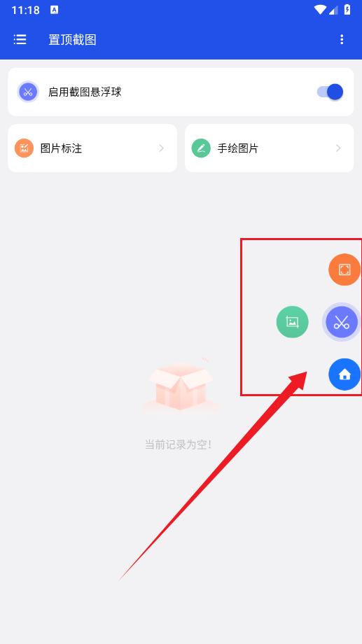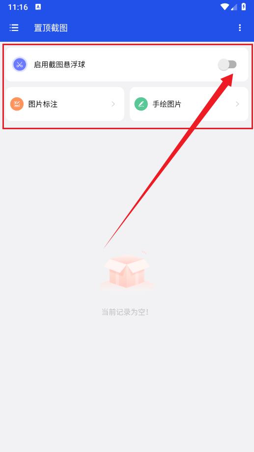 2、进入软件,如图所示,有一个启用截图悬浮球开关按钮和图片标注、手绘图片两个功能入口,然后我们开启截图悬浮球开关按钮。