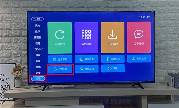 6、投送完成以后,在TCL电视中打开欢视助手(没有的话在应用商店下载一个),找到【管理】--【打开U盘】;