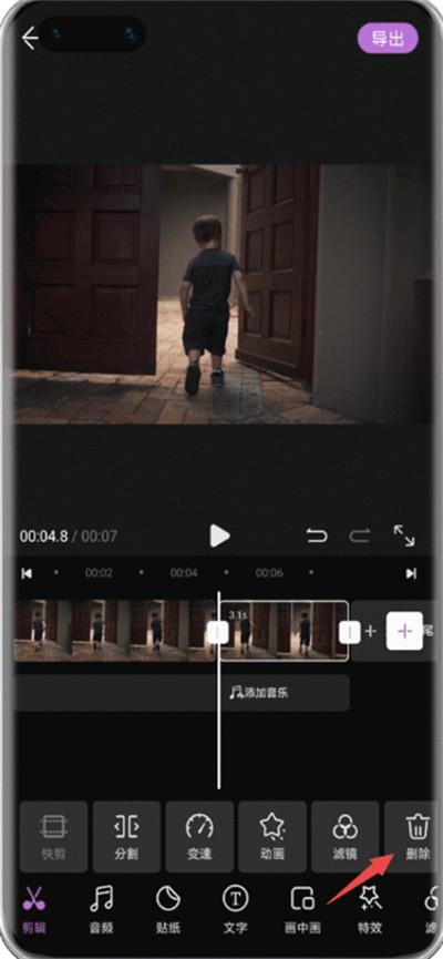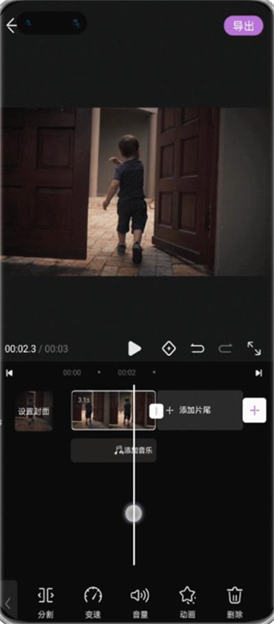 1、在剪辑页面中,移动白色的指针到你需要删除部分的开始位置,在工具栏中选择分割,把视频分成两段;