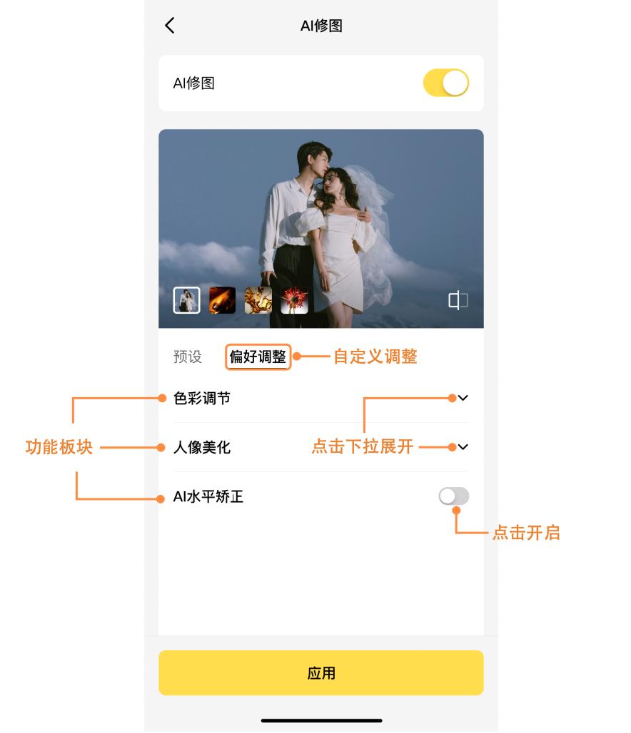 色彩:预设中可包含AI色彩风格及色彩调节板块色彩参数调整。