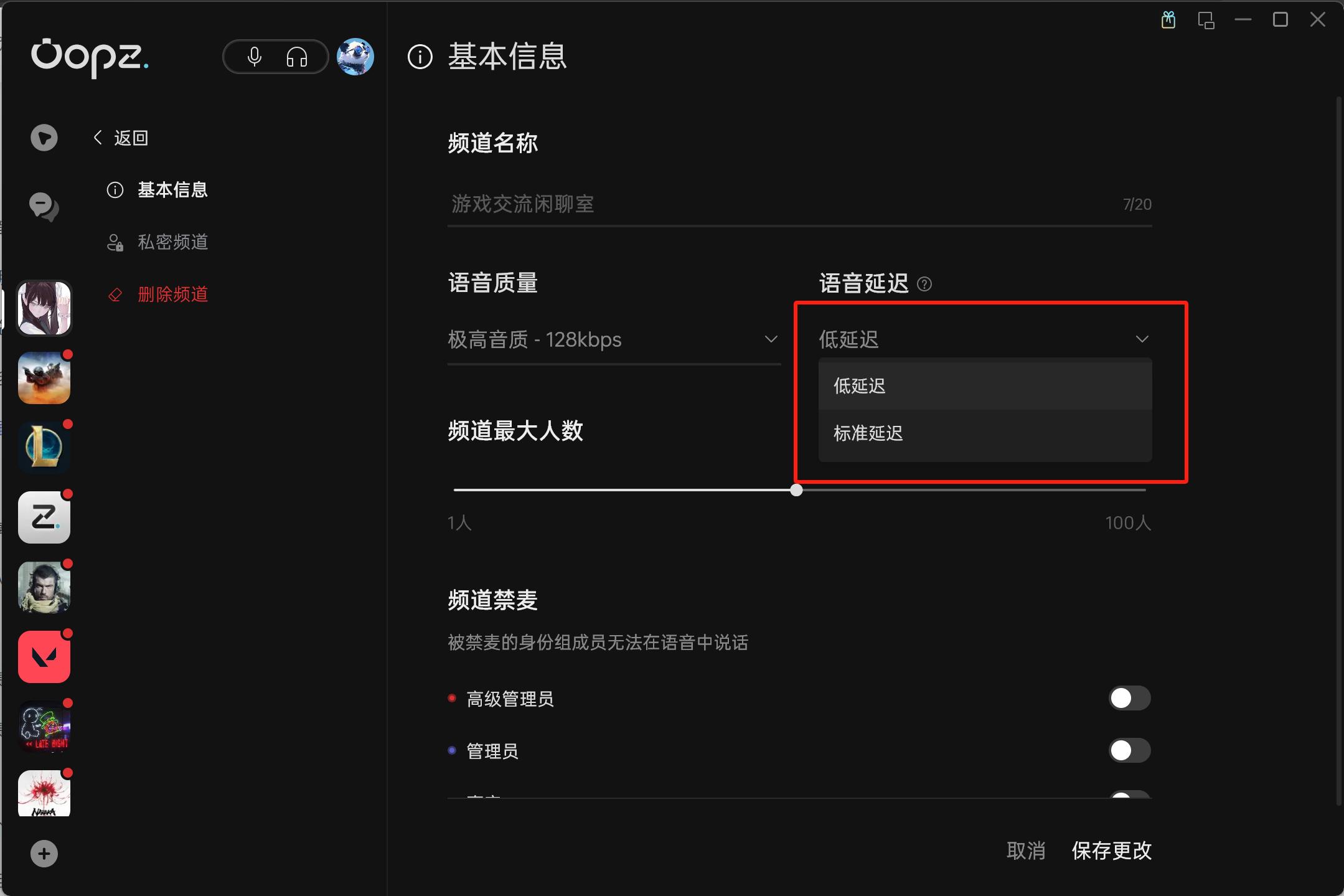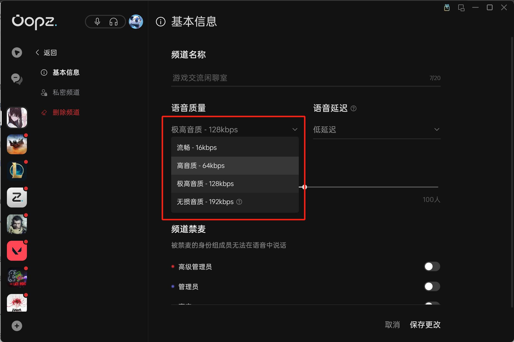 第三步:点击语音质量或语音延迟的下拉框,选择你想要修改的码率或延迟模式。请注意,语音质量越高、延迟越低,对频道内所有用户的网络要求就越高,请按照小伙伴们的实际情况进行合理的设置哦。