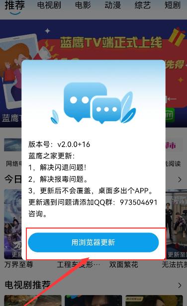 蓝鹰问题汇总如下:下载篇和更新篇:APP出现更新提示,直接选择浏览器更新。如下图: