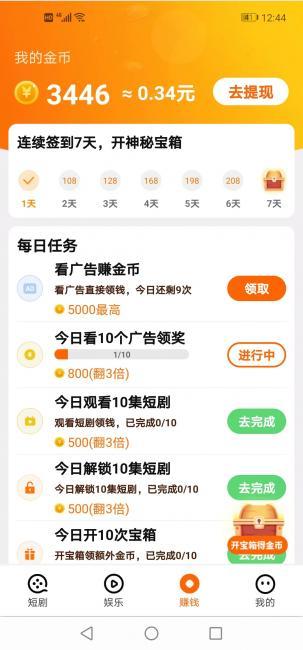 每天累计看满10个广告可以获得800个金币,每天观看10集短剧可以获得500金币,每天解锁10集短剧奖励500金币,每天开10次宝箱领额外金币,并且完成开宝箱任务领取800金币(翻3倍)。