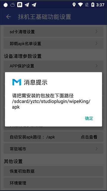 自动安装apk:将APK包存放在执行的路径(/sdcard/yztc/studioplugin/wipeking/apk),每次新机后均会自动安装该目录下的apk文件