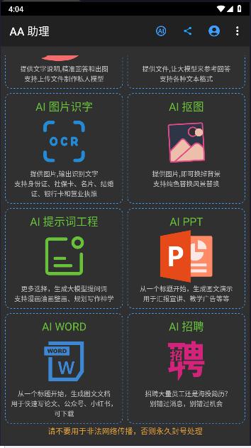 AI大模型问答机器人移动版平台是一款集成了多种人工智能功能的应用,集合了多种AI问答功能,包括但不限于AI视频生成、AI换脸、AI机器人自动回复、AI文生图、AI话画、AI私域、AI图片识字、AI抠图等,功能十分丰富,不妨下载试试吧。