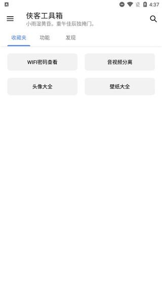 没有广告没有会员打开就可以直接免费使用的一款手机工具箱软件,侠客工具箱app的功能超级的全面包含了日常工具,查询工具,计算工具,文字工具,图片工具,音视频工具,系统工具和其他工具,有需要的可直接下载。