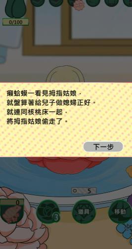 一路上遇见各种各样的童话角色,帮助迷你的拇指姑娘完成各种考验。