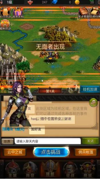 2、角色在挂机状态下会自动战斗并获得游戏内的大量资源,你能在其中换取到各式各样不同的佣兵和装备,并通过培养自己的佣兵和装备等方面增强实力。