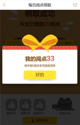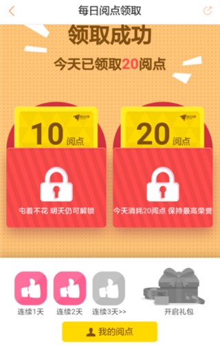 4、如果昨天消耗了阅点,则今天领取的是20阅点,如图所示。