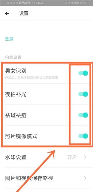 5、进入设置界面后,分别点击【男女识别、夜拍补光、祛斑祛痘和照片镜像模式】后面的【开启按钮】进入。如下图所示