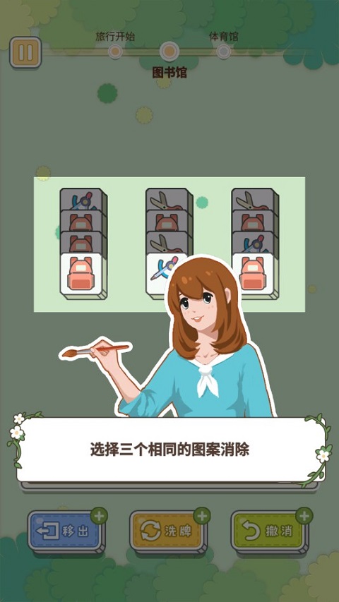 小美旅行日记游戏规则类似《羊了个羊》,点击图案会自动存放在底部的物品栏里,每三个相同的图案可以进行消除。消除会解锁全新的图鉴。另外,这里还提供了移出、洗牌和撤销,三种道具。